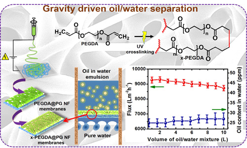 我們采用先進的工業(yè)膜技術,利用所制備的x PEGDA @ PG NF膜所顯現(xiàn)的超親水性膜超低濕潤時間,結合相對的疏水特性,以實現(xiàn)達到有效的分離為兩個不相混溶的油-水混合物和油包水微乳液,且僅由重力驅動。